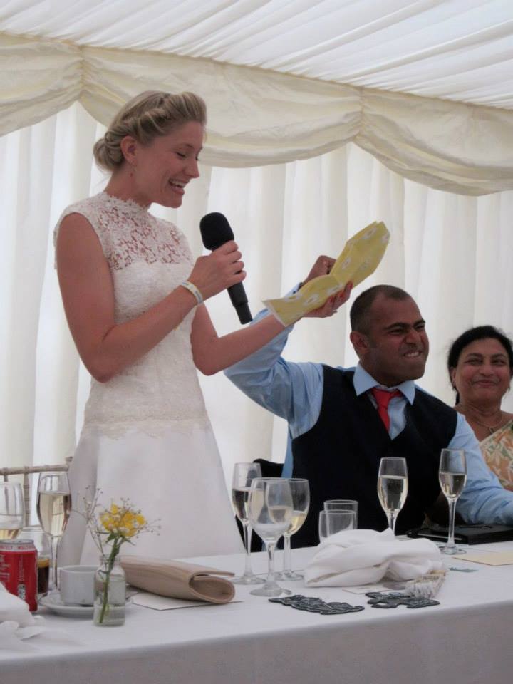 I recently attended the nuptials of a fabulous friend of mine Davina to her gorgeous fella Bash, and was blown away by the attention to detail and the creative and personal touches they brought to the event. Held in a marquee in a field at Bash’s old primary school, the day was peppered with scholarly touches, with dinner-money envelopes being utilised as name cards and an old desk being used as the collection table for cards and gifts. Furthermore, Davina’s lovely mother had even hand-stitched printed tags of Davina and Bash’s names (the type your own mum used to sew into your itchy grey school jumper) onto yellow ribbon to tie around the serviettes. These we proceeded to tie around our wrists festival-style and I actually didn’t remove it all week.